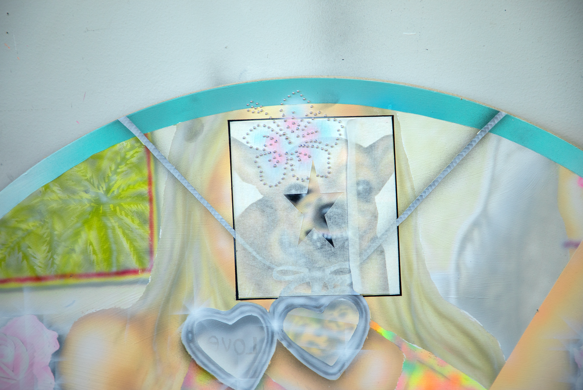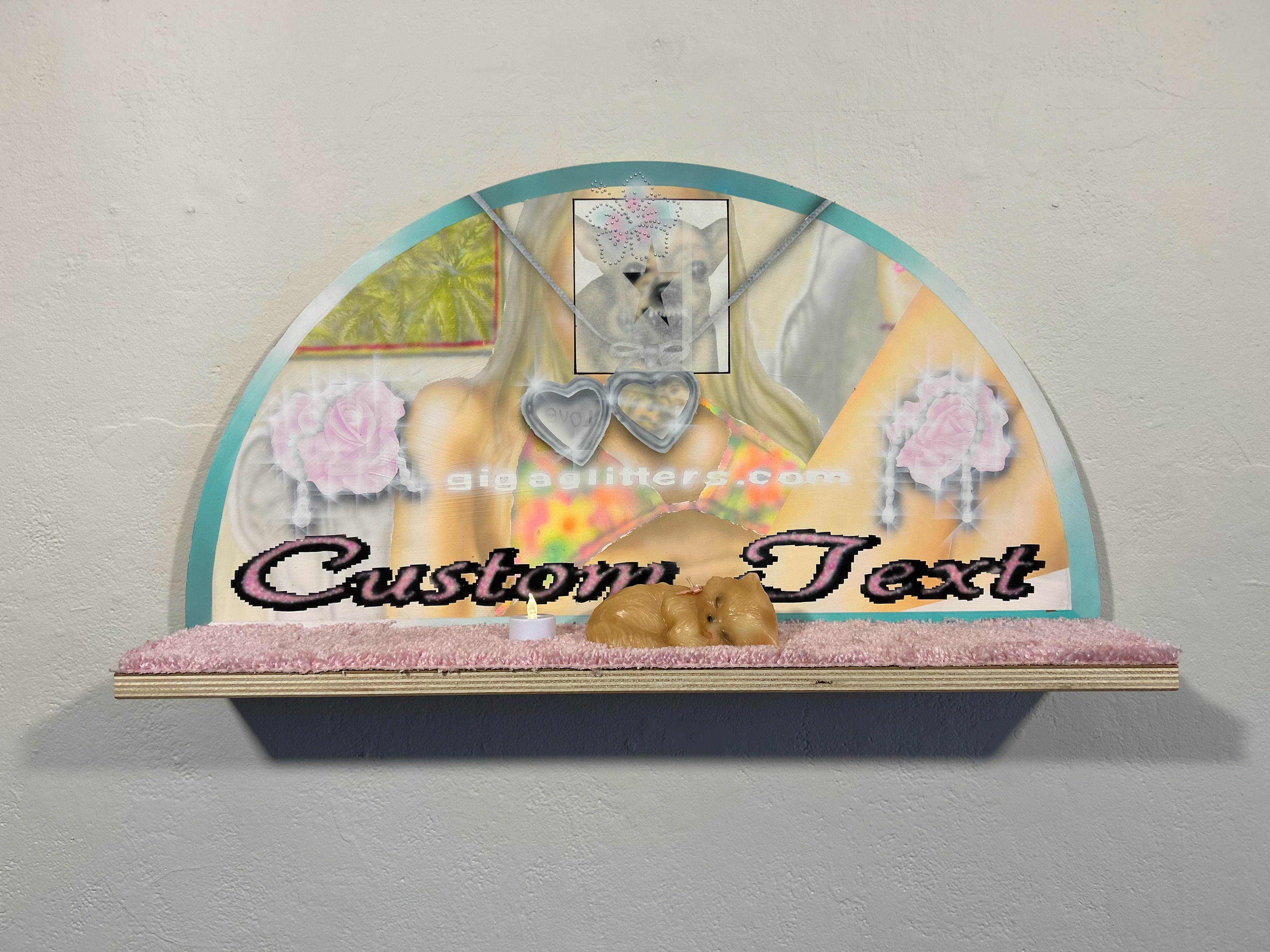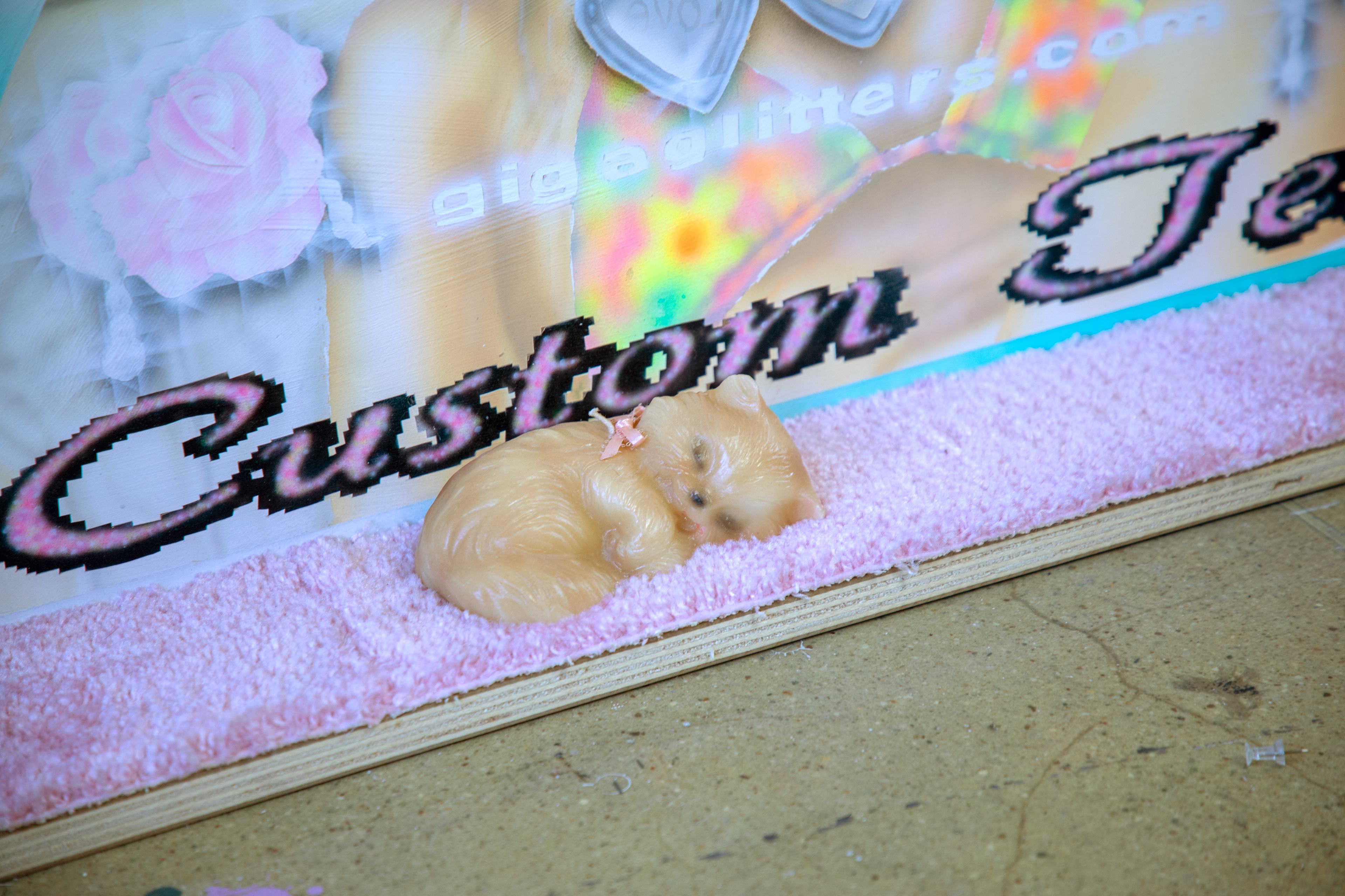 2024 ☆ 30x20 inches ☆ airbrush acrylic on panel, carpet, kitten candle, masking tape